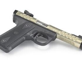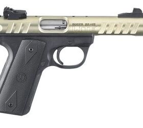 The Ruger 22/45 Lite™ upper receiver is made of aircraft-grade aluminum and features serrated cuts, giving the pistol a dramatic look and making it extremely lightweight at only 22.8 ounces. The 4.4-inch stainless steel barrel sleeve is held in place by a tension nut to ensure accuracy and features a factory 1/2-28 thread to accept popular muzzle accessories. The receiver is finished in a striking gold anodize and is drilled and tapped for Weaver®-style scope base adapters (included free of charge) for easy mounting of optics. The comfortable, precision-molded Zytel® polymer grip frame features replaceable Hogue® black rubber grip panels that can be swapped out to customize the look of your Ruger 22/45 Lite™ pistol. The Ruger 22/45 Lite™ is the perfect outdoor companion and can be used for target shooting, plinking, small game hunting, or competitive shooting.
