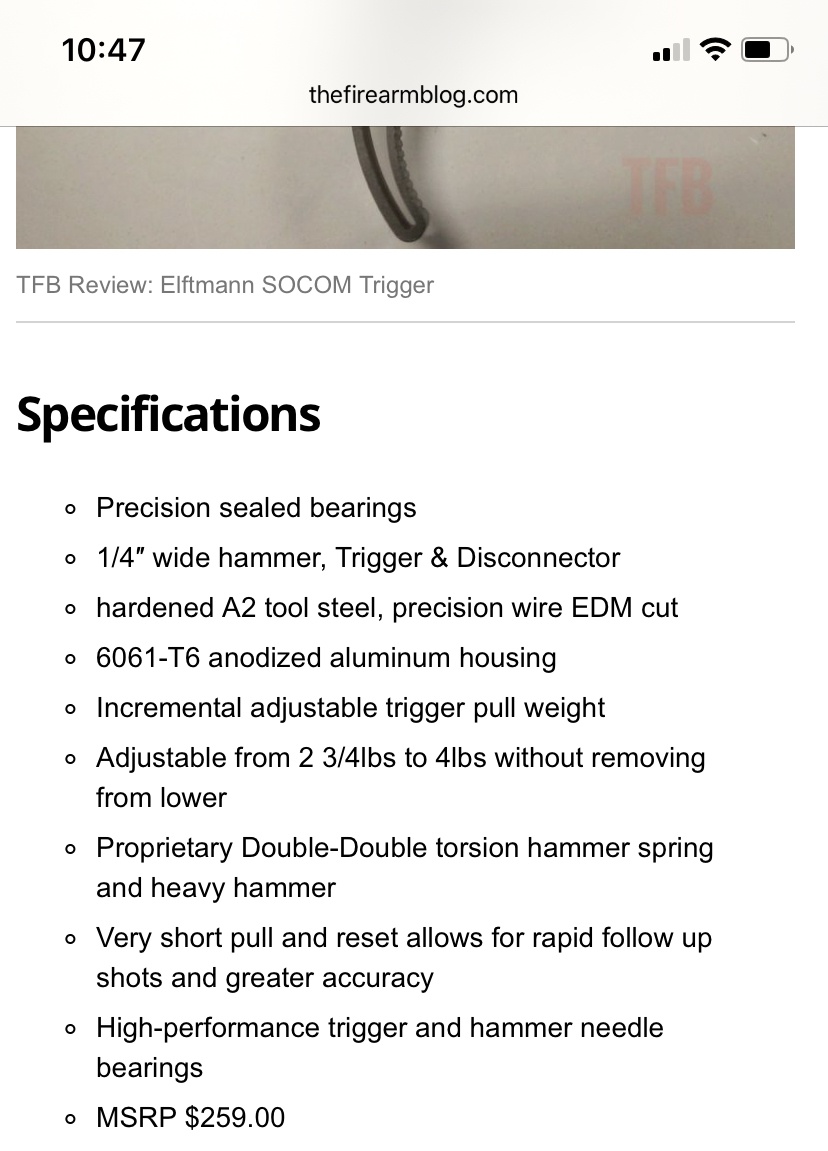 The ELF SOCOM is a five-star trigger. I find no fault with it. A zero take-up trigger with a clean crisp break. The reset is pronounced but smooth. The sealed bearings allow smooth and fast movement of the trigger and hammer. The price point may get some, but you will notice the difference to other drop-in triggers every time it is taken to the range.